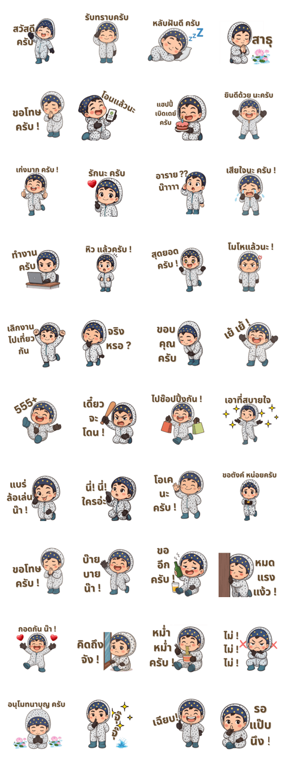 | スタンプ説明 | Little Tora with a gentle smile, wearing warm tree-patterned pajamas and a soft indigo star hat. His peaceful little face. |