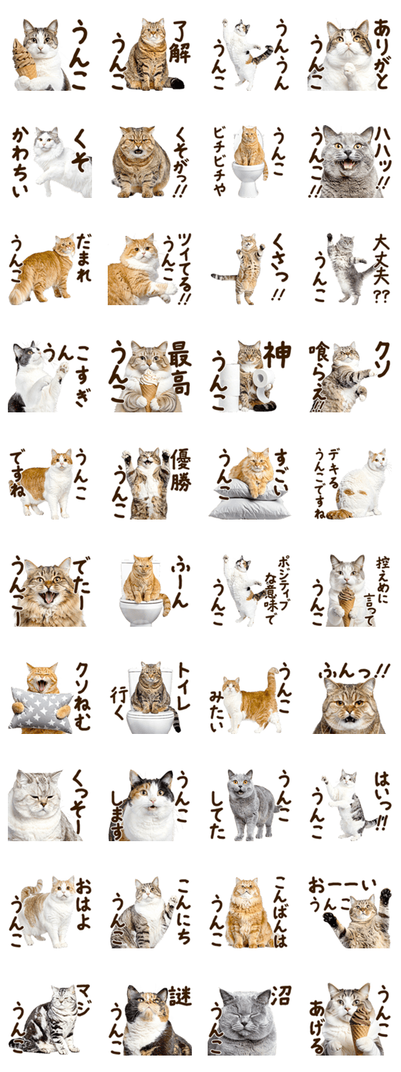 うんち可愛いデブネコの写真スタンプ。定番面白いネタ毒舌煽りギャグ下ネタ笑えるアホバカゆるい。推しでぶねこ科動物男子女子先輩友達のプレゼントにおすすめにゃんとも!
