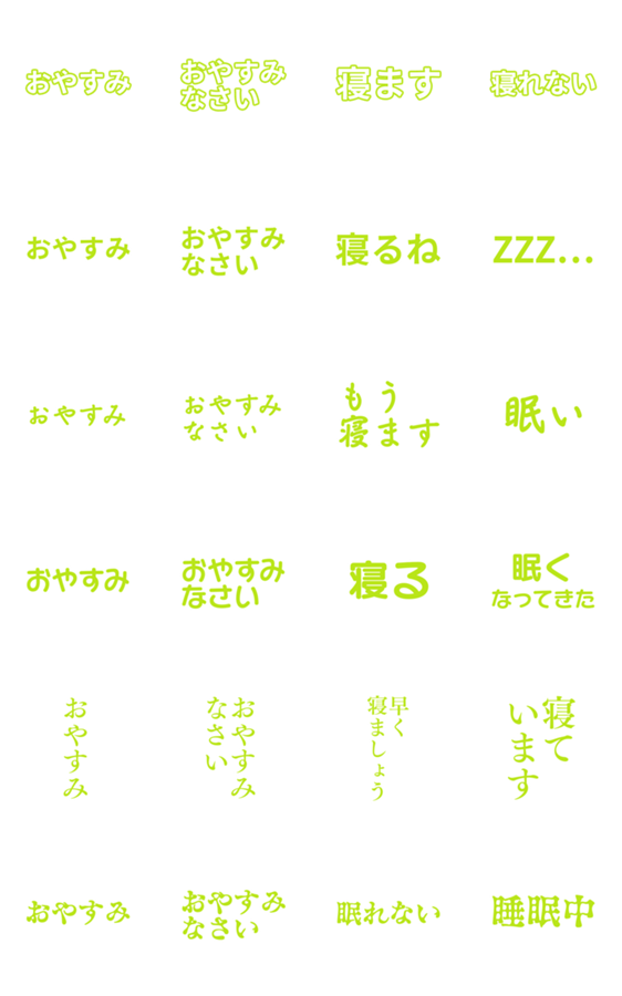 黄緑の色々な書体・おやすみなさい・寝ます・寝れない・眠い・睡眠・文字だけ・ペン字・丸文字・明朝体・好きな色・アイドルのメンバーカラー・推し・イエローグリーン