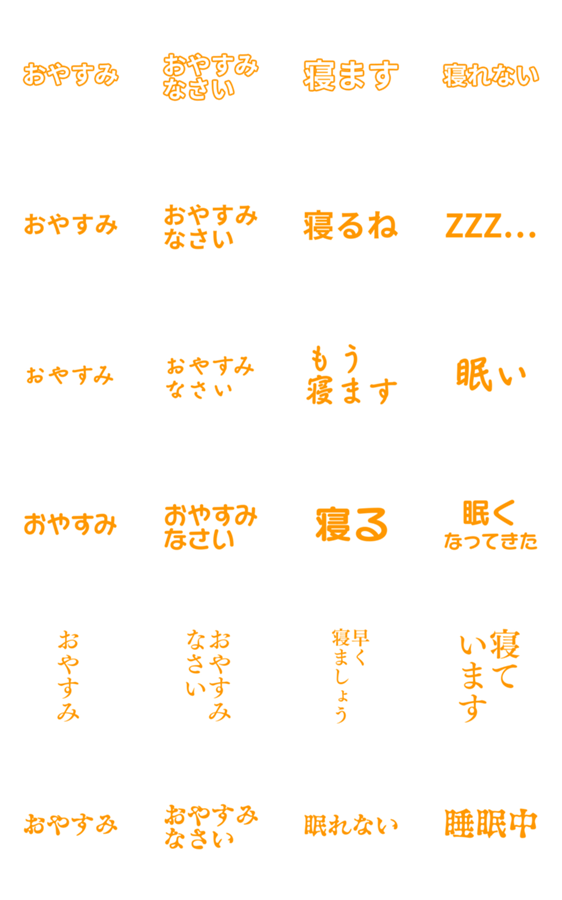 オレンジ色の色々な書体・おやすみなさい・寝ます・寝れない・眠い・睡眠・文字だけ・ペン字・丸文字・明朝体・好きな色・アイドルのメンバーカラー・推し・担当・メンカラ
