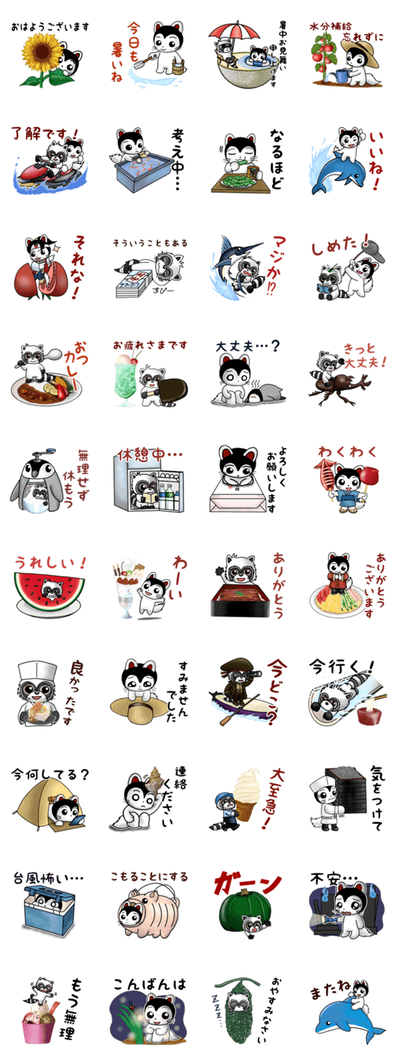 | スタンプ説明 | こま&たんたんのかわいくてほっこりするシーン満載♪夏の日常で使えるスタンプです。リアルなグルメも見どころです。(挨拶/暑い/暑中見舞い/台風/夏野菜/料理/スイーツ) |