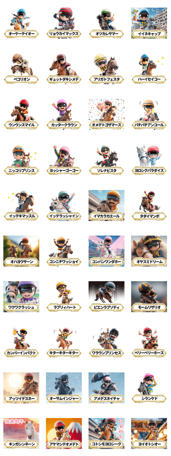 | スタンプ説明 | 実況なしのシンプル版。よみがえる架空の名馬たち。日常生活でも使いやすい。競馬好きの方にプレゼントすればウケること間違いなし。年末年始あけおめ対応。午、ウマ |