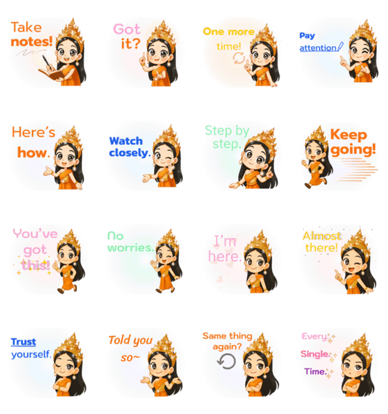 タイ風スタイルのスタンプで、先生・コーチ・上司の女性たちを応援!可愛くて丁寧、でも自信たっぷりなワークトークを楽しもう!