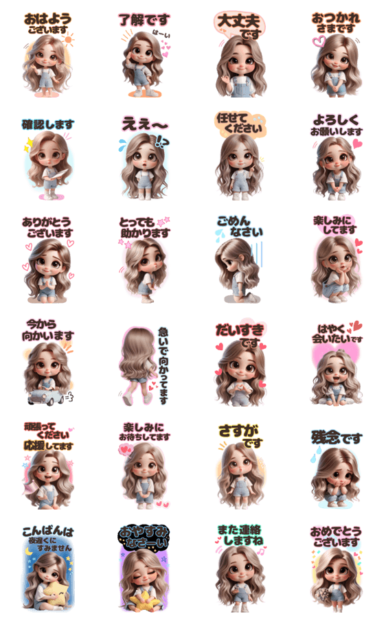 可愛いオーバーオールの女の子の敬語スタンプのBIGスタンプです。毎日/使える/女の子/可愛い/ギャル/丁寧/敬語/先輩/友達/ママ友/挨拶/日常/見やすい ※このスタンプはトークルームで大きく表示されるBIGスタンプです。