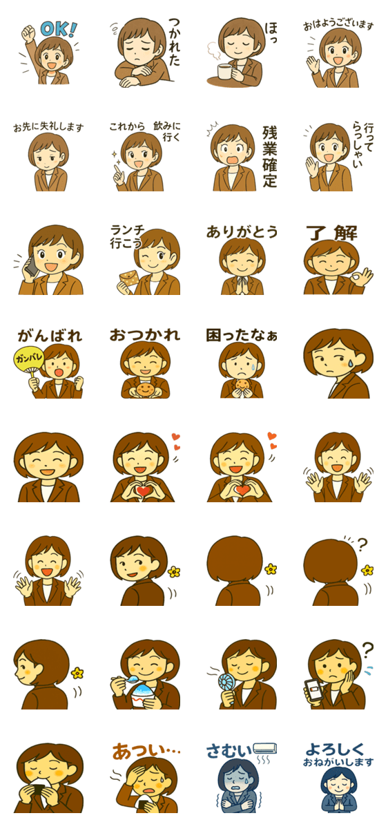 バタバタな毎日でも、笑顔と共感を忘れないOLのスタンプセット。オフィスあるあるをキュートにお届けします!