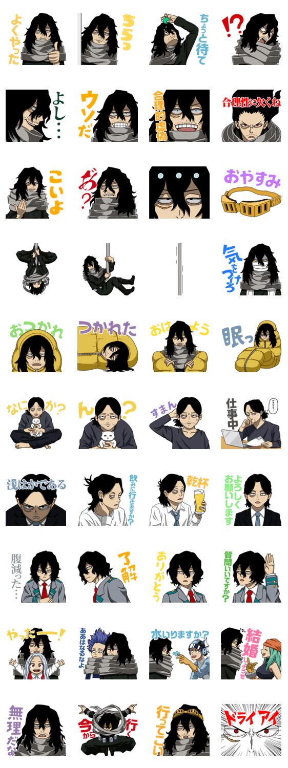 相澤先生に関する事だけで40個!いつも素敵で愛される相澤先生を是非使いまくってください! ※LINE Creators Collaboration 僕のヒーローアカデミア参加スタンプです。