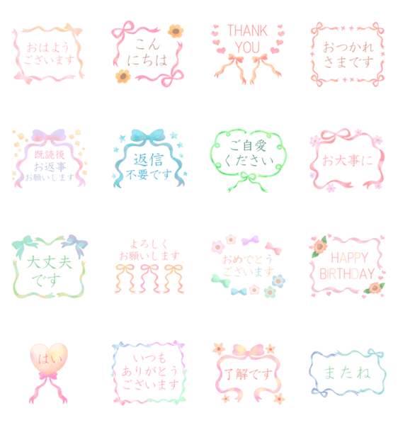 くすみパステルカラーのリボン・ハート・花などのフレーム+見やすい文字あり版♡手軽にポンと押せる挨拶や日常会話などの文字大きめの大人可愛いスタンプです♪