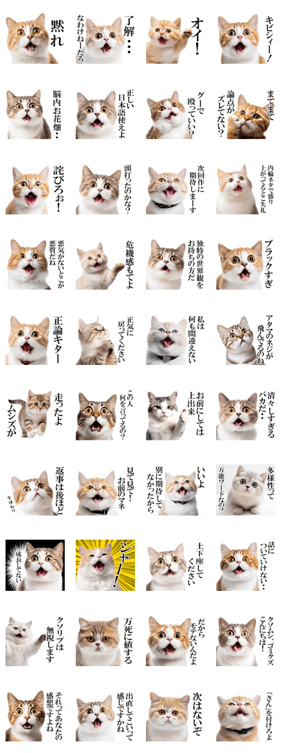感情がつい顔に出てしまう猫のスタンプ第二弾です。 ねこ/ネコ/かわいい/日常会話/感情表現/毒舌/煽り/驚き/カワイイ/面白い/ネタ/シュール/動物/ミーム/ラブリー