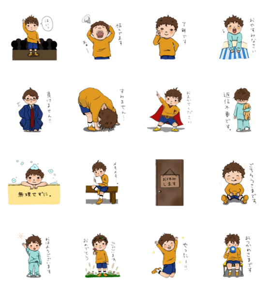 | スタンプ説明 | 5歳児の男の子が敬語を使うスタンプです。先輩や上司に使うのにぴったり!文面も使いやすいと思うのでみんな是非いっぱい送ってね |