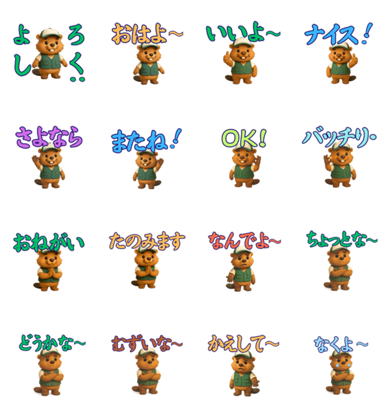 | スタンプ説明 | シンプルなデザインで、家族や友達同士で使いやすいあいさつが沢山!。 かわいい・・が好きな方におすすめです。。 ビーバーたちの多彩な表情をお楽しみください。 |
