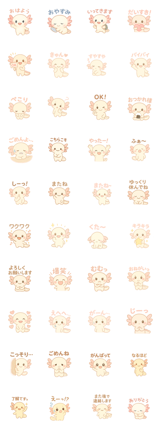 ほんのりピンクでふんわり可愛いウーパールーパー「うぱまる」のスタンプです。日常会話にぴったりの表情やセリフがいっぱい!毎日のやりとりをもっと楽しく♪