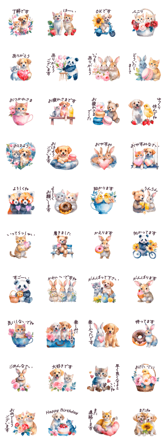 動物のシンプル水彩風スタンプ。毎日/連絡/敬語/丁寧/挨拶/グループ/家族/友達/PTA/ママ友/ネコ/イヌ/パンダ/くま/ひよこ/うさぎ/レッサーパンダ/動物//花/毎日送りやすい