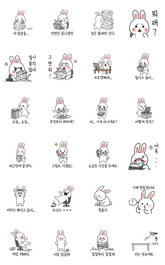 ウサギで会社員の感情を表現したスタンプです。日々の喜びや怒りが詰まっています。(KR ver.)