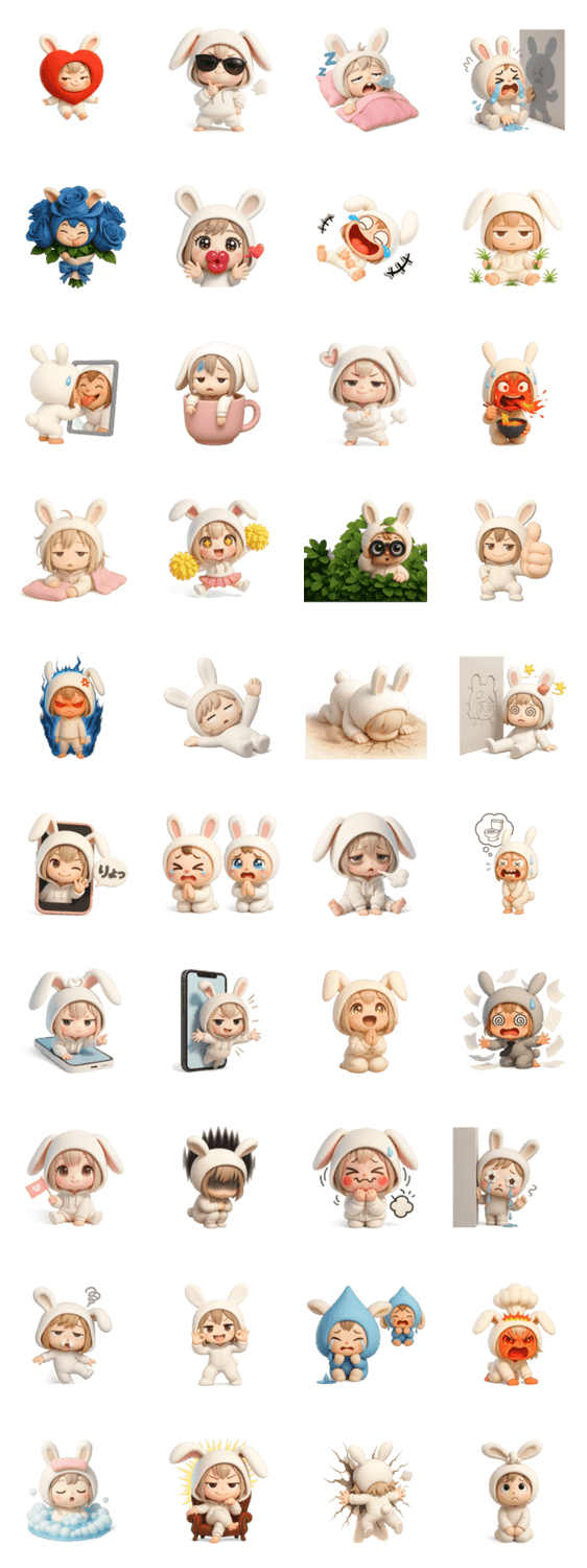 文字無しなのでアレンジや自分の好きな様に使えるスタンプです。 うさぎの着ぐるみを着た小さな女の子の、ギャグ感満載の表情や表現多めです。 かわいい/日常/おもしろい