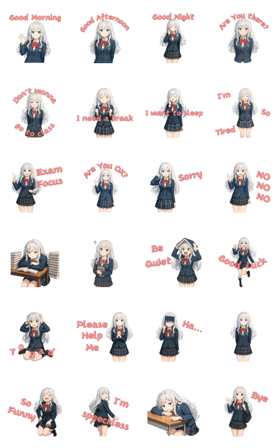 | スタンプ説明 | A white-haired high school girl expresses every student's daily struggles. Perfect for exams, chats, and daily use. |