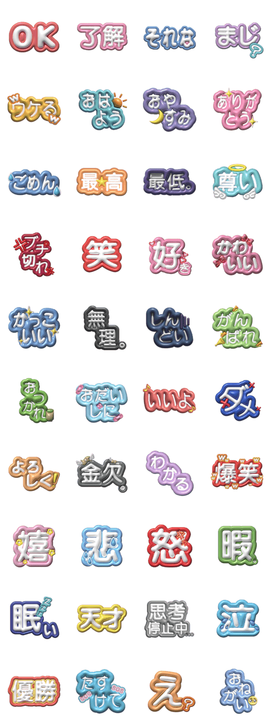使いやすさ重視!ぷっくり文字がかわいい♪ あいさつ/返事/共感など、毎日使えるフレーズを集めました! シンプルなのに映える“送るだけで気持ち伝わる”スタンプです◎