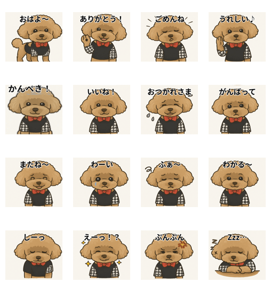 These LINE stickers feature a fluffy Toy Poodle with a stylish outfit and red bow tie.