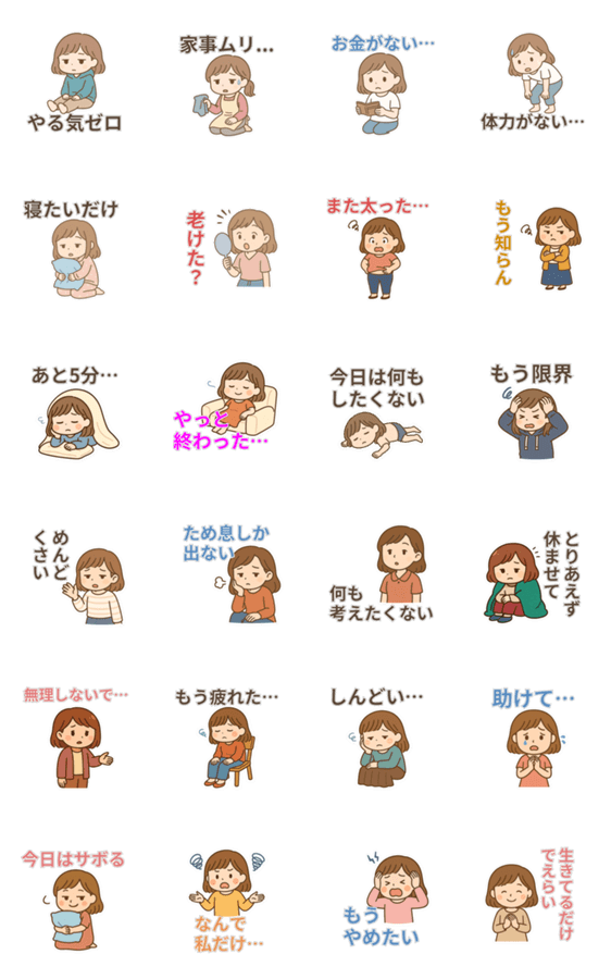 「やる気ゼロ」「もう限界」「家事ムリ」など、日常の小さな絶望や自虐を表現!疲れた・落ち込んだ・サボりたい時にぴったり。友達や家族に気軽に送れる可愛いスタンプ。