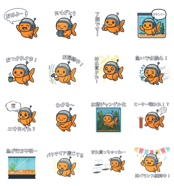 | スタンプ説明 | アクアリウムとロボットの融合キャラ「アクアロくん」が、水槽ライフのあるあるをお届けします!アクアリストもそうでない人も楽しめる、可愛く使いやすいスタンプです。 |