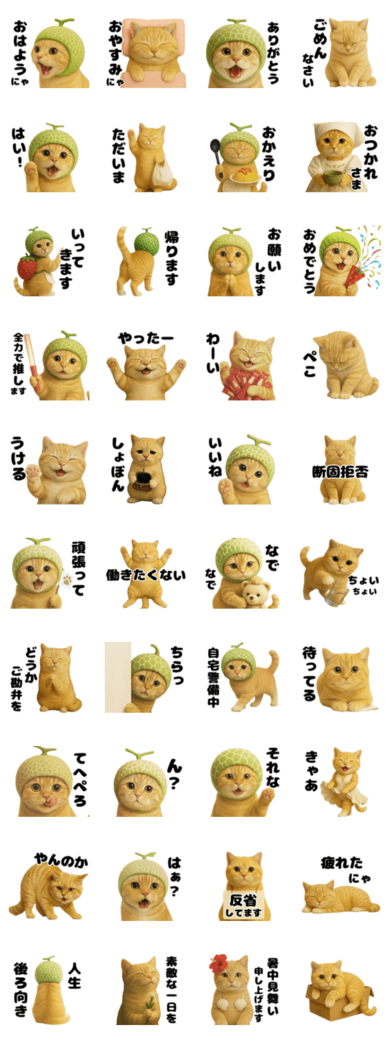 | スタンプ説明 | 「にゃんこめろん」がゆるくてかわいいスタンプになりました。 あいさつにも、ちょっとしたツッコミにも◎ 改定版として再リリースしました。 |