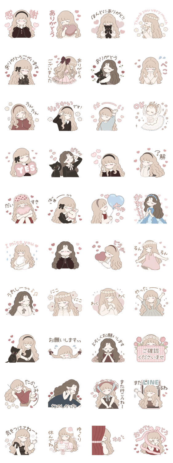 毎日使いやすい可愛い女の子スタンプ。ハートでふんわり優しい返信に。(基本/日常/家族/友達/彼女/彼氏/ママ友/敬語/ロングヘア/ピンク/淡色/くすみ/かわいい/やさしい)