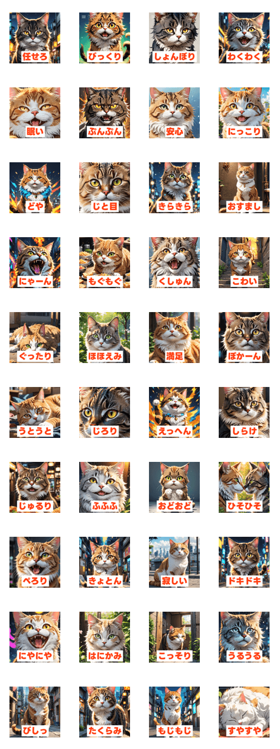 | スタンプ説明 | 表情豊かな40匹のネコたちが、あなたの気持ちを代弁します。ぜんぶ“にゃんこ”にお任せ!日常会話から特別な日まで幅広く使える、かわいさ満点のLINEスタンプです。 |