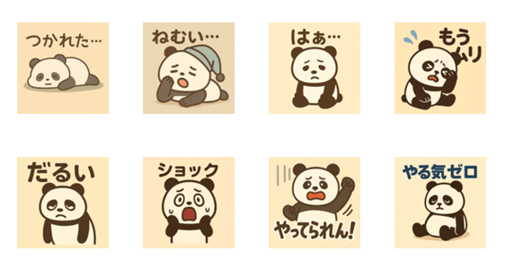 | スタンプ説明 | 疲れた、だるい、やる気ゼロ…そんな気分をかわいいパンダが代弁!「もうムリ」「ねむい」など、ゆるく楽しく気持ちを伝えられるスタンプです。 |