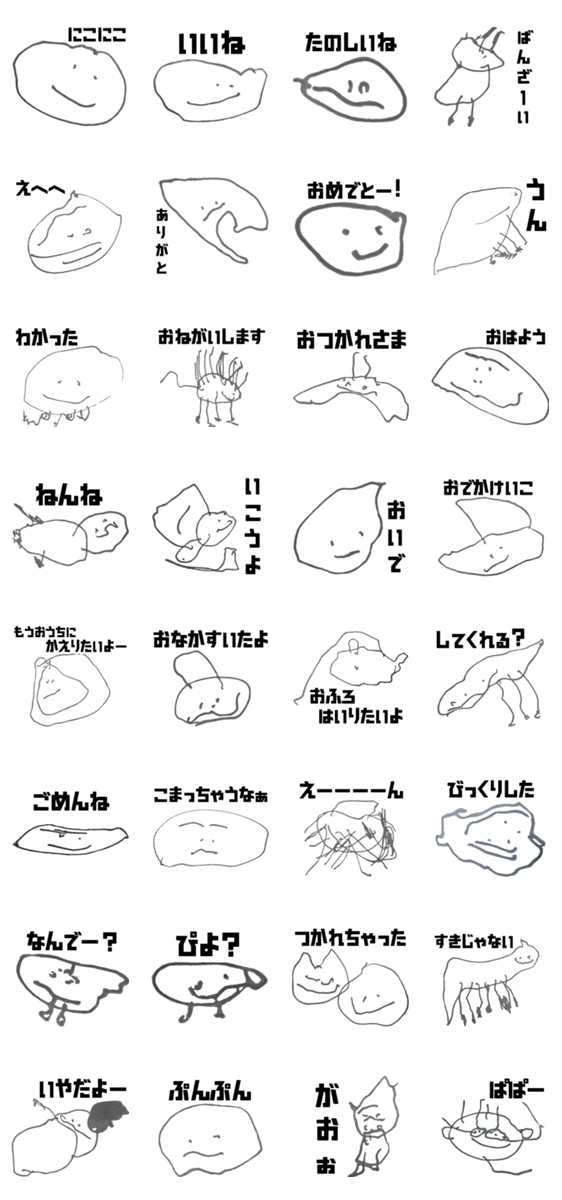 2歳11か月のまろさんの絵を集めたスタンプです。 人の顔や恐竜の絵を描き始めました。