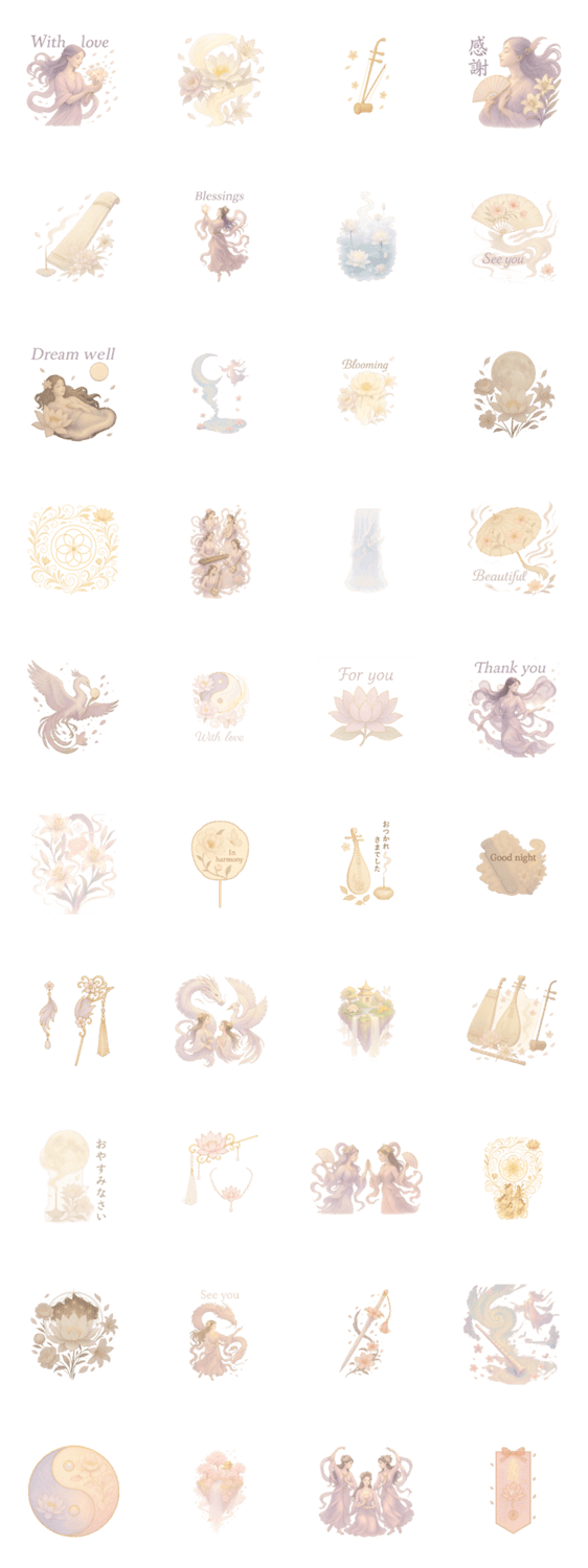 | スタンプ説明 | 仙境 天女 二胡 琴 龍 鳳凰 蓮 香 蓬莱 霊符 太極図 - 縁起と癒しのモチーフと共に 天上界の調べを、ふわりと花の香のように、そっと会話へ漂わせて 。* |