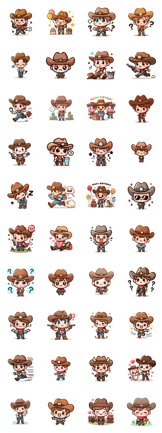 元気いっぱいのカウボーイスタンプでチャットを彩ろう!西部の魅力や遊び心ある挨拶、冒険気分をお届けします。