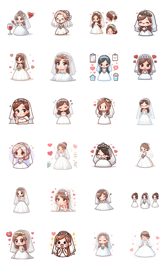 愛と結婚をお祝いするかわいい花嫁カートゥーンスタンプ!ロマンチックな雰囲気や結婚祝い、幸せな瞬間を友人や大切な人に届けましょう。