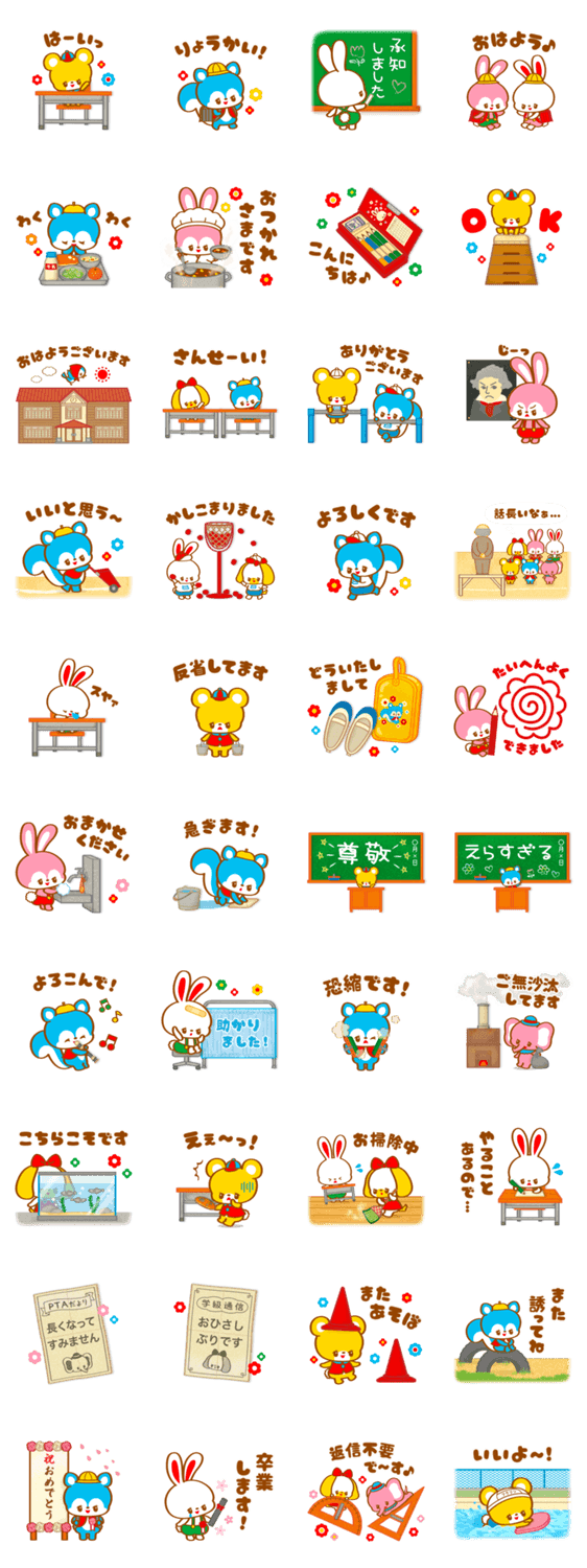 | スタンプ説明 | 小学校に楽しく通う、おちゃめフレンズのスタンプ♪【日常会話/敬語/海/くま/リス/うさぎ/犬/昭和レトロ/レトロポップ】 |