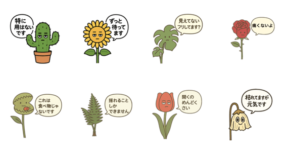| スタンプ説明 | サボテン、花、観葉植物などがシュールな表情やセリフでおしゃべり。ちょっと笑えて癒される、日常トークにぴったりのスタンプです。 |
