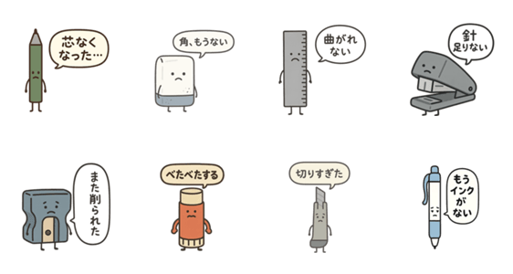 | スタンプ説明 | ペンや消しゴム、ホチキス、定規などの文房具たちが、ゆるくてシュールな表情で日常会話を彩ります。ちょっと笑えるトークのお供に。 |