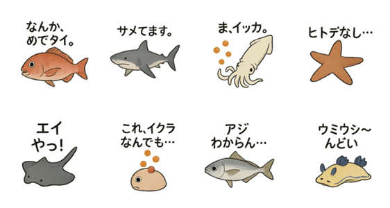 | スタンプ説明 | タイ、イクラ、イカ、ヒトデ、エイ、サメ、アジ、ウミウシなど海の仲間たちが、ゆるくてかわいいダジャレでトークを盛り上げます。 |