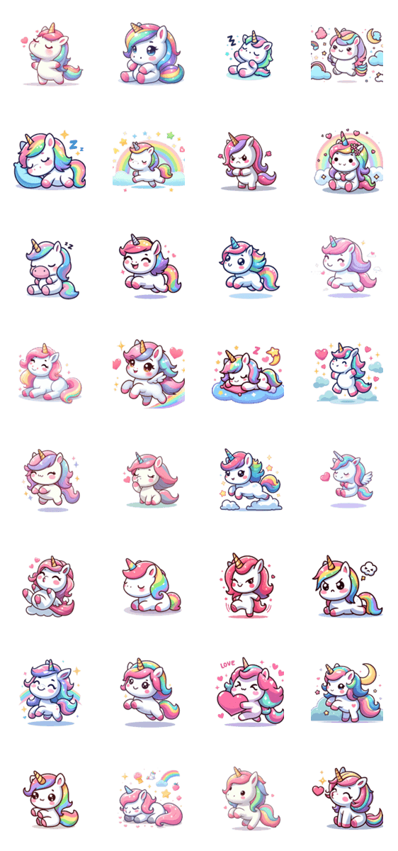 このユニコーンのカートゥーンスタンプで、チャットに魔法と可愛さをプラス!毎日ハッピーで夢のある雰囲気を届けます。