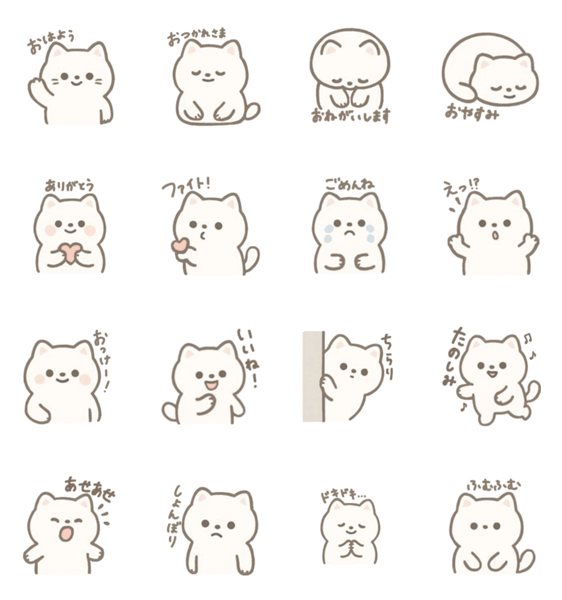 やさしい表情のにゃんこで柔らかく気持ちを伝えよう!。「ありがとう」「ごめんね」「おっけー!」など、毎日の会話にぴったり。笑顔やハートで気持ちもかわいく表現。