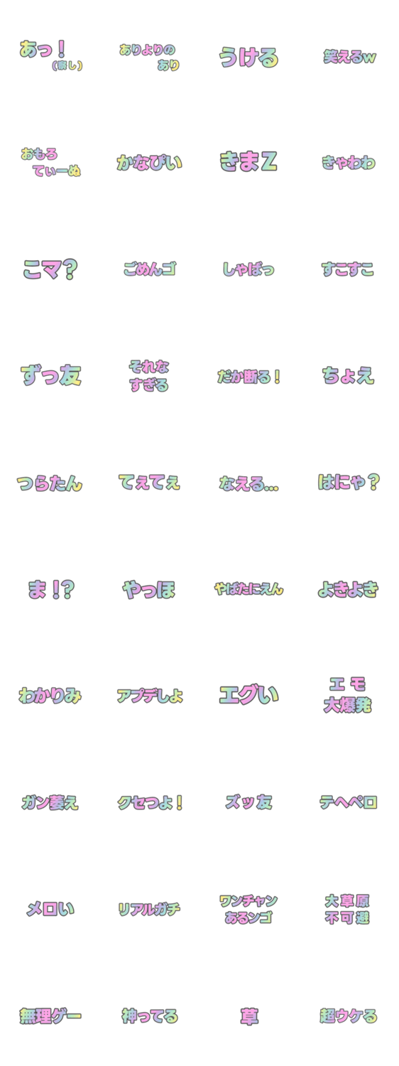 シンプルな文字のみタイプのスタンプです。どなたでもご使用出来ると思います。流行り言葉 若者言葉のスタンプです。虹色 レインボー レインボウ