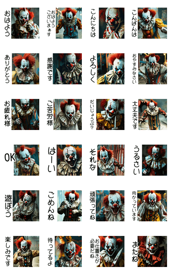 ホラー/グロ/閲覧注意/うざい/びっくり/煽り/ピエロ/キラークラウン/ネタ/面白い/ギャグ/怖い/殺人鬼/キモ可愛い/シリアルキラー/ポップアップ/サイコパス/草/ハロウィン