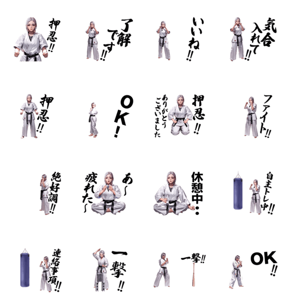 | スタンプ説明 | リアルアニメ風のリアルに動く空手女子スタンプです。前蹴り、回し蹴り、突きから、胴回し回転蹴りまで。バット折り・瓦割りも再現。伝統派、フルコン、流派を問わず! |