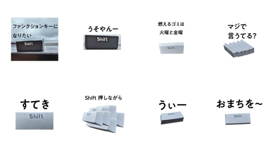 | スタンプ説明 | 日常の「なんか一言ほしい」に、ちょっとズレてるShiftキーがお応えします。 使えば使うほどクセになる、全Shiftキー共鳴型スタンプ |