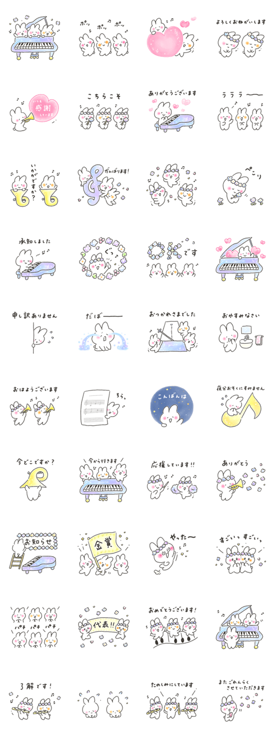 ピアノの先生や音大生、吹奏楽部や音楽好きなあなたにおすすめ♡毎日使える、かわいいうさぎのスタンプです。敬語もお花もいっぱい!フルートやトランペットもあるよ!