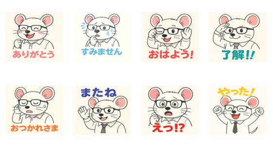 「メガネをかけたサラリーマンねずみ、アルジャーノン。 本人はしっかり者のつもりだけど、実はチキンな性格⁉ビジネスのやりとりにも便利なスタンプです!」