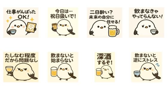 今日は飲んでもいい日…かも?お酒を飲む言い訳を、シマエナガがかわいく代弁してくれます。お酒好きなあなたにぴったり!