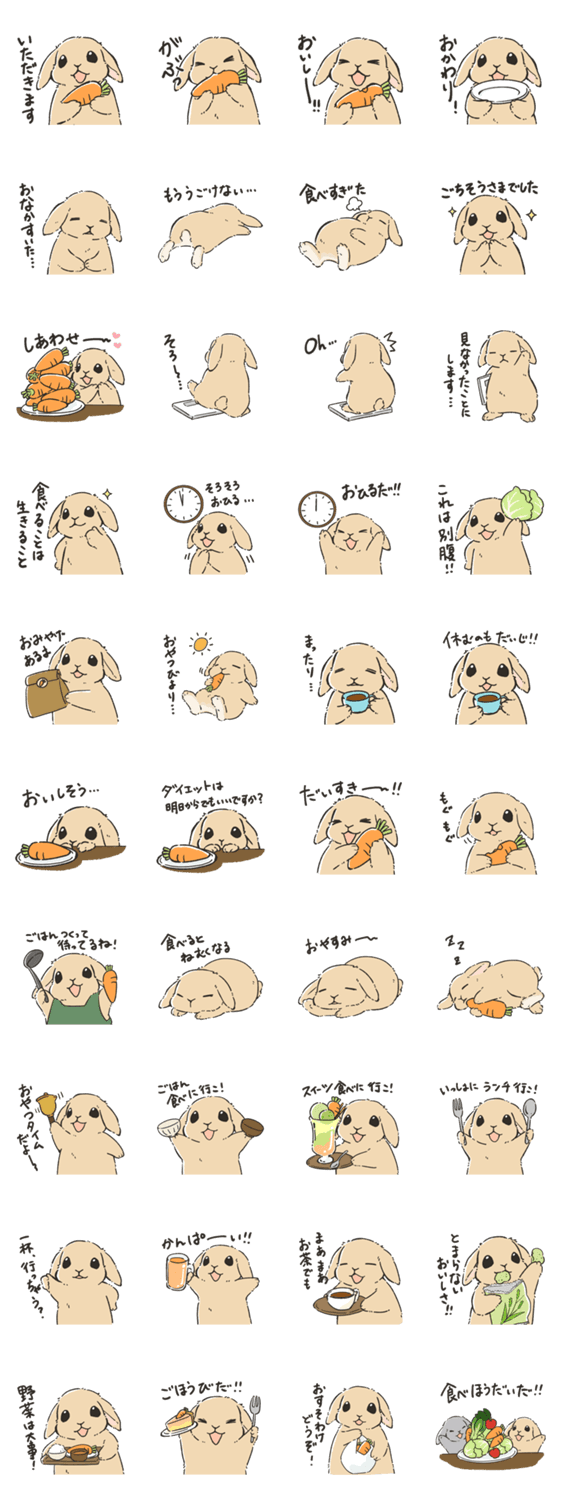 お野菜大好き!おなかいっぱい食べたい!食べて幸せ! そんな垂れ耳うさぎさんの楽しいスタンプです。