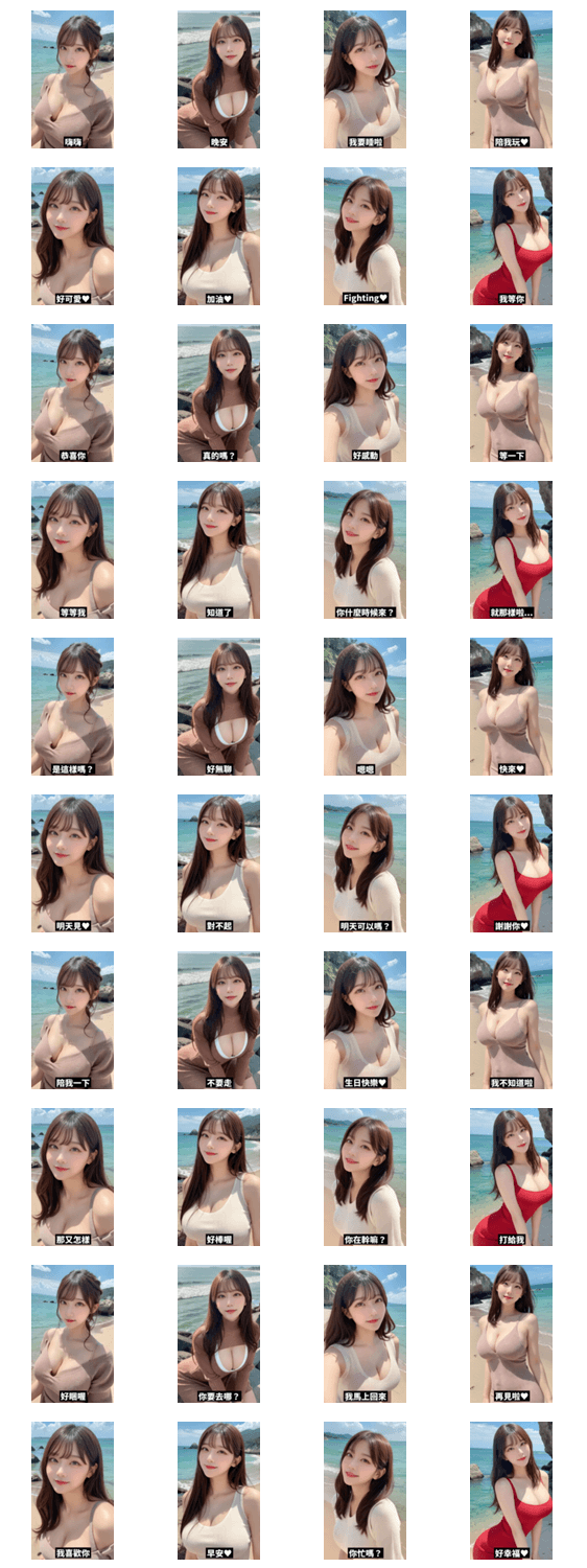 | スタンプ説明 | summer love look 9siP These stickers will show up extra large in chats. |