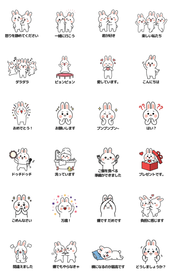 ウサギの様々な感情と日常会話を表現したスタンプです。(JA)