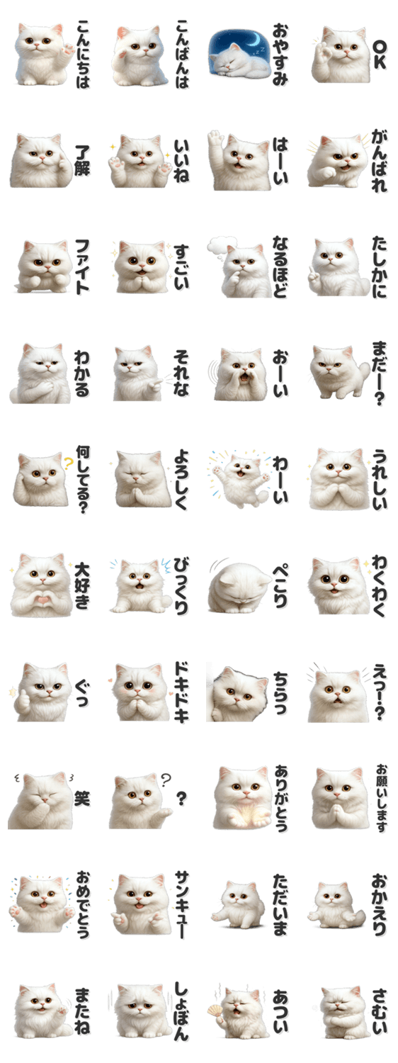 ふわふわ可愛いペルシャ猫の日常スタンプです。/ねこ/癒し/ゆるい/もふもふ/ふんわり/白い/白猫/どうぶつ/挨拶/返事/返信/相槌/毎日/友達/シンプル/優しい