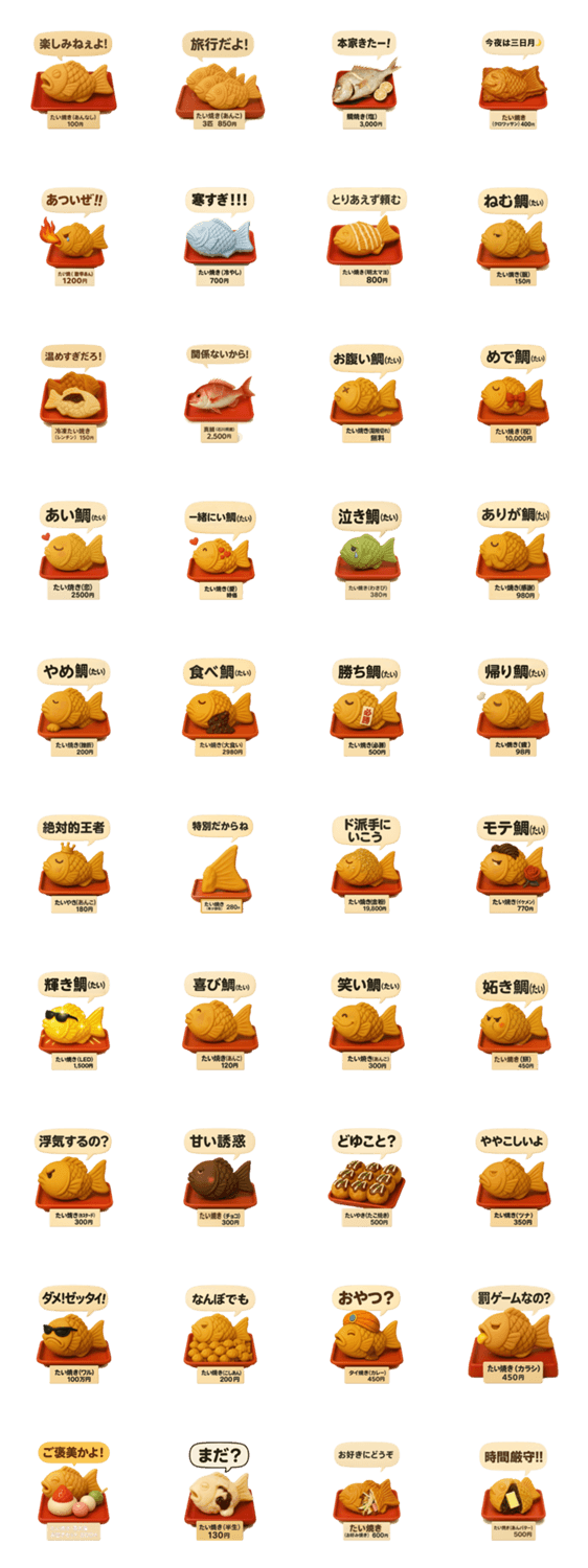 | スタンプ説明 | 意外と使えるスタンプです。美味しそうな、たい焼きと一緒に過ごそ。 |
