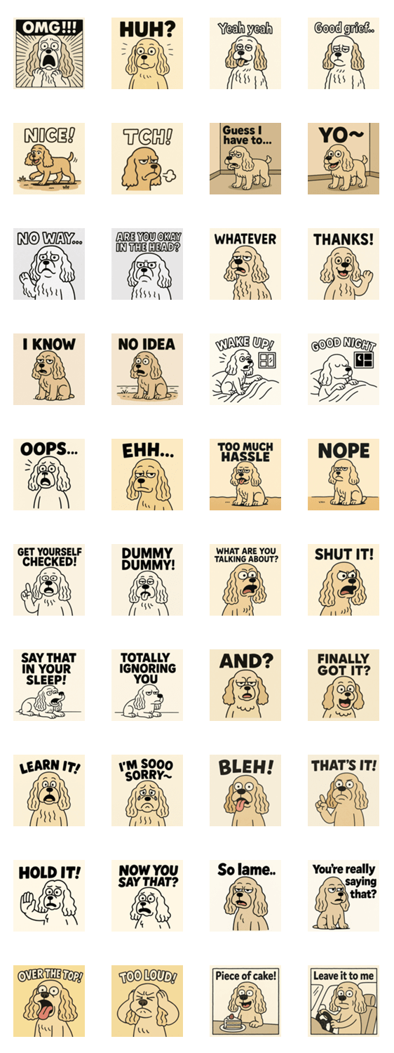 超シンプル顔のコッカースパニエル。ゆるくて脱力、でもなんか笑える。じわじわクセになるシュール系スタンプ!